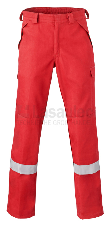 Vlamvertragende en antistatische werkbroek voorzien van verdekte ritssluiting, 2 ingezette zijzakken met klep, achterzak met klep, duimstokzak met klep, dijbeenzak met klep, kniezakken, elastiek in rug, reflectieband.
