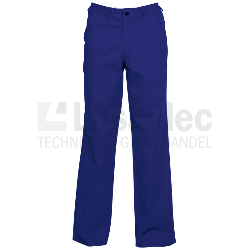 Werkbroek voorzien van verdekte ritssluiting, twee ingezette zijzakken, twee achterzakken waarvan één met knoop, duimstokzak en elastiek in rug.