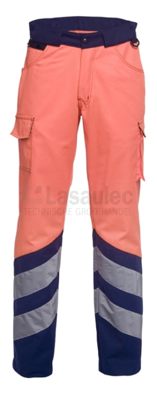 Werkbroek voorzien van een ritssluiting, 2 ingezette zijzakken waarvan 1 met horlogezakje, 2 achterzakken met klep, duimstokzak met rolmaatzakje, dijbeenzak met klep, GSM-zakje en een reflectieband.
