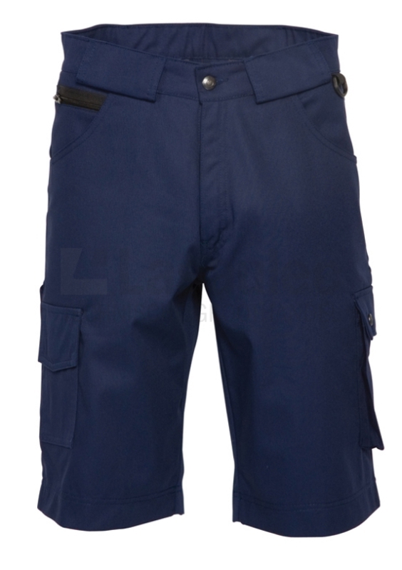 Korte broek voorzien van verdekte ritssluiting, 2 ingezette zijzakken waarvan 1 met horlogezakje, 2 achterzakken met klep, duimstokzak met rolmaatzakje, dijbeenzak met klep, GSM-zakje met klep, Cordura® versterkingen, 1 D-ring voor en 1 D-ring achter.