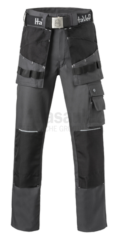Verdekte ritssluiting, 2 zijzakken, 2 loshangende voorzakken, 2 achterzakken, duimstokzak, dijbeenzak met klep en GSM-zakje, verstelbare Cordura® kniezakken, riem, Cordura® versterkingen, hamerlus, reflecterende piping