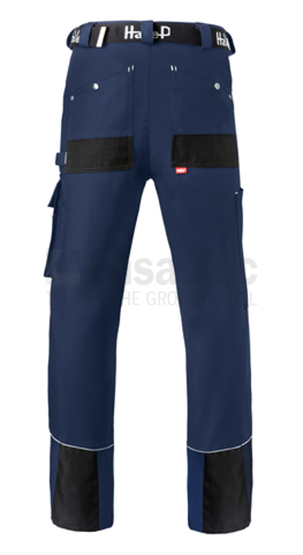 Verdekte ritssluiting, 2 zijzakken, 2 loshangende voorzakken, 2 achterzakken, duimstokzak, dijbeenzak met klep en GSM-zakje, verstelbare Cordura® kniezakken, riem, Cordura® versterkingen, hamerlus, reflecterende piping