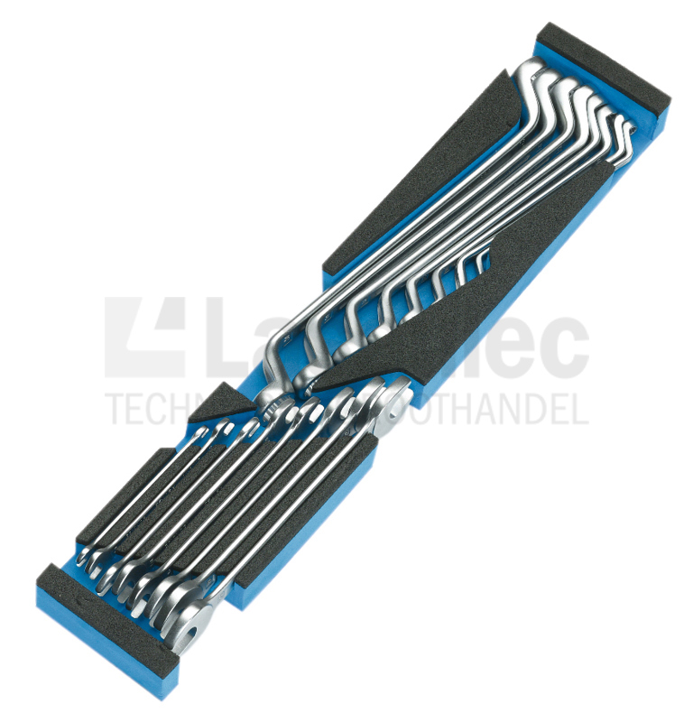 - Ringsleutel, diep gebogen, 6 x 7 mm, 8 x 9 mm, 10 x 11 mm, 12 x 13 mm, 14 x 15 mm, 16 x 17 mm, 18 x 19 mm, 20 x 22 mm