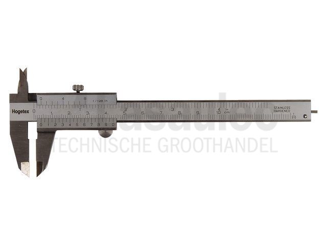 Deze schuifmaat is klein van formaat! Handig voor in de binnenzak. Aflezing in mm en inch. Aflezing 0,05mm en 1/128” Meetbereik: 0-100mm Uitgevoerd met klemschroefblokkering, matverchroomde nonius en geslepen meetvlakken. Voor binnen-, buiten-, en dieptemetingen. Verpakt in Etui.