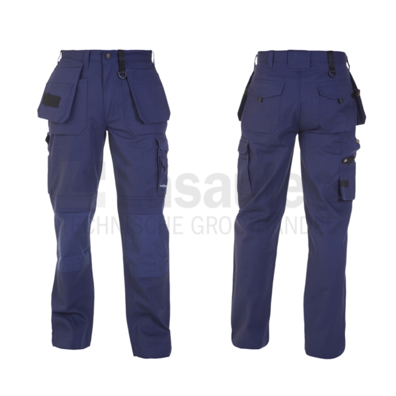 Werkbroek voorzien van Cordura kniezakken in de kleur van het kledingstuk, verlengde zoom, verstelbaar in taille met elastiek, 2 achterzakken met klep, 2 hamerlussen, 2 D ringen, dijbeenzak met klep, telefoonpocket, potloodzak, extra zak voor timmermanspotlood, extra pennenzakje, dubbele duimstofzak met extra knoop om mes aan te hangen, 2 extra gereedschapslussen met extra knoop en drievoudig gestikte naden voor maximale sterkte. Swingpockets zijn afgerond om beter grip te houden op kleine onderdelen die in de voorzakken opgeborgen kunnen worden.