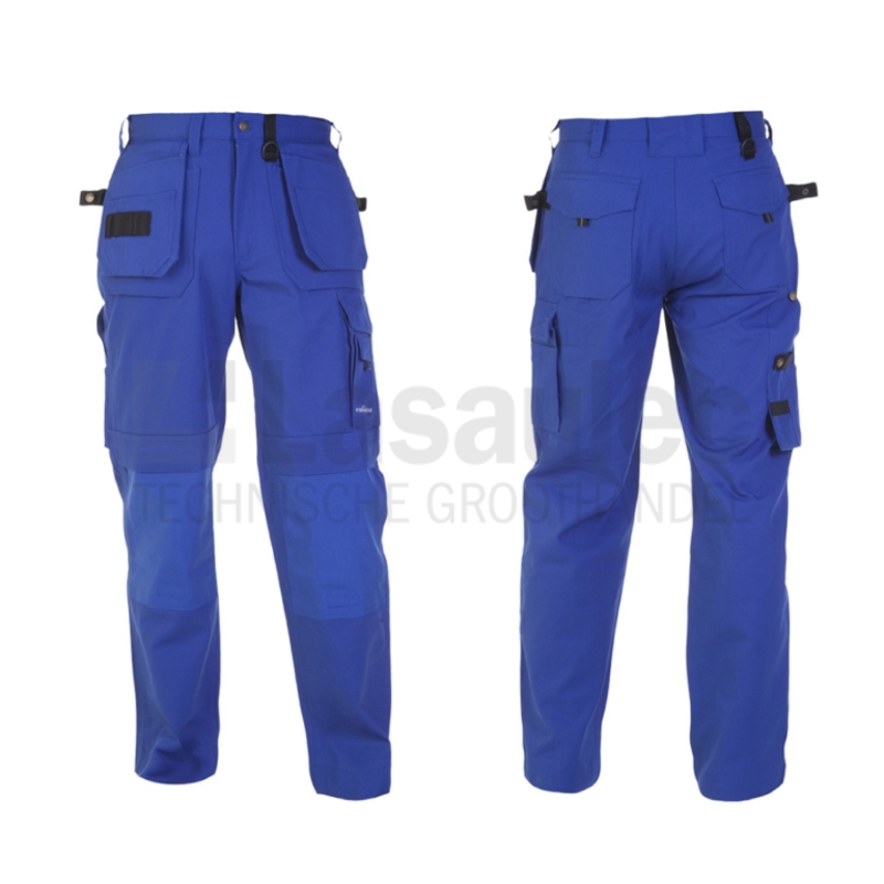 Werkbroek voorzien van Cordura kniezakken in de kleur van het kledingstuk, verlengde zoom, verstelbaar in taille met elastiek, 2 achterzakken met klep, 2 hamerlussen, 2 D ringen, dijbeenzak met klep, telefoonpocket, potloodzak, extra zak voor timmermanspotlood, extra pennenzakje, dubbele duimstofzak met extra knoop om mes aan te hangen, 2 extra gereedschapslussen met extra knoop en drievoudig gestikte naden voor maximale sterkte. Swingpockets zijn afgerond om beter grip te houden op kleine onderdelen die in de voorzakken opgeborgen kunnen worden.