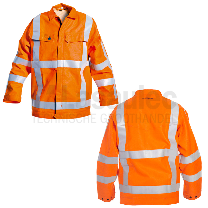 Vlamvertragende en antistatische Atex werkjas, voorzien van RWS striping, borstzakken met klep en drukkopen, manchetten verstelbaar d.m.v. drukknopen, verdekte sluiting met rits en drukknopen.