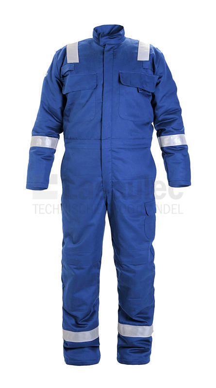 Vlamvertragende winteroverall voorzien 2 borstzakken met klep en drukknoop, dijbeenzak met klep en drukknoop, achterzak met klep en drukknoop, 2 steekzakken en ritssluitng verdekt met flap en drukknopen. De wintercoverall beschermt tegen elektrische vlambogen en is voorzien van Offshore reflecterende striping, manchetten en broekspijpen verstelbaar met drukknopen en gasdetectielus.
