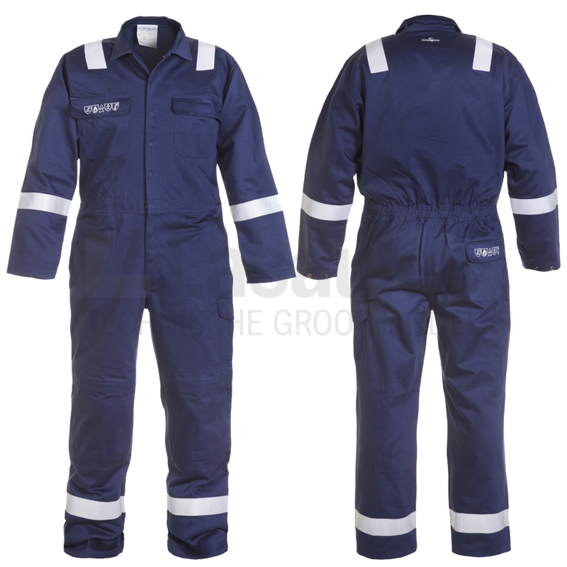 Vlamwerende en antistatische overall voorzien van kniezakken, drukknoopsluiting, twee borstzakken met klep en drukknoop, dijbeenzak met klep en drukknoop, achterzak met klep en drukknoop en twee steekzakken. Tevens heeft de overall elastiek in de taile, verstelbare manchetten met drukknopen, verstelbare pijpen met drukknopen, gasdetectielus en offshore reflecterende striping.
