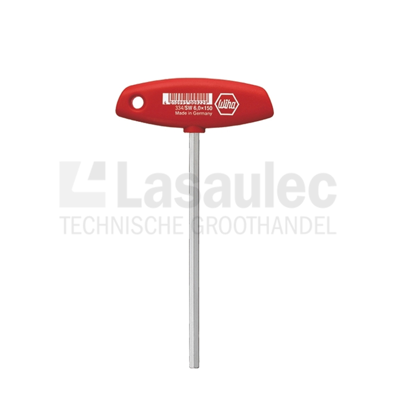 Inbussleutel ten behoeve van binnenzeskantschroeven voorzien van T-greep van rood slagvast abs kunststof, kling vervaardigd uit chroom vanadium staal, doorgehard, hoogglans vernikkeld.