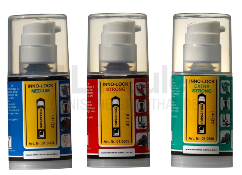 Anaeroob schroefdraadborgingsproduct dat volgens de nieuwste technologie op dit gebied ontwikkeld. De set bestaat bevat drie verschillende sterkten: Medium, Strong en Extra Strong. Inno-Lock Medium (Blauw) Zorgt voor een middelsterke borging en wordt gebruikt in plaats van een zelfborgende moer. Is bestand tegen schokken en trillingen bij schroef draaddiktes tot 6 mm. Eenvoudig te demonteren (losdraaimoment: 13-22 Nm). Inno-Lock Strong (Rood) Zorgt voor een sterke borging van schroefdraad van 6 tot en met 10 mm. Demonteren is mogelijk, maar vereist enige krachtinspanning (losdraaimoment: 22-33 Nm). Inno-Lock Extra Strong (Groen) Zorgt voor een zeer sterke borging van lagers en schroefdraad van meer dan 10 mm. Moeilijk te demonteren (losdraaimoment: 23-40 Nm).