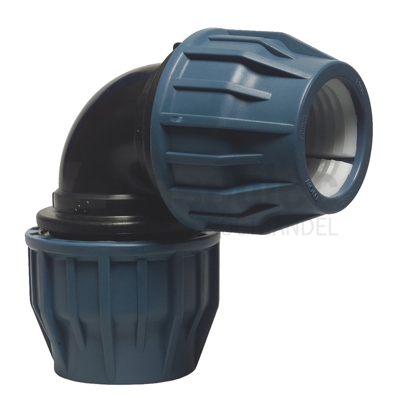 Jason kniekoppeling 90° voorzien van knelaansluitingen, geschikt voor kunststof drukleidingsystemen.
