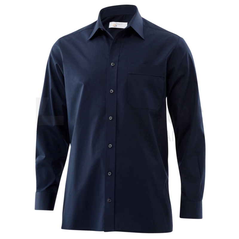 Klassiek Popelineshirt voorzien van kentkraag, een borstzak en knoopsluiting. Extra lange mouw 72cm.
