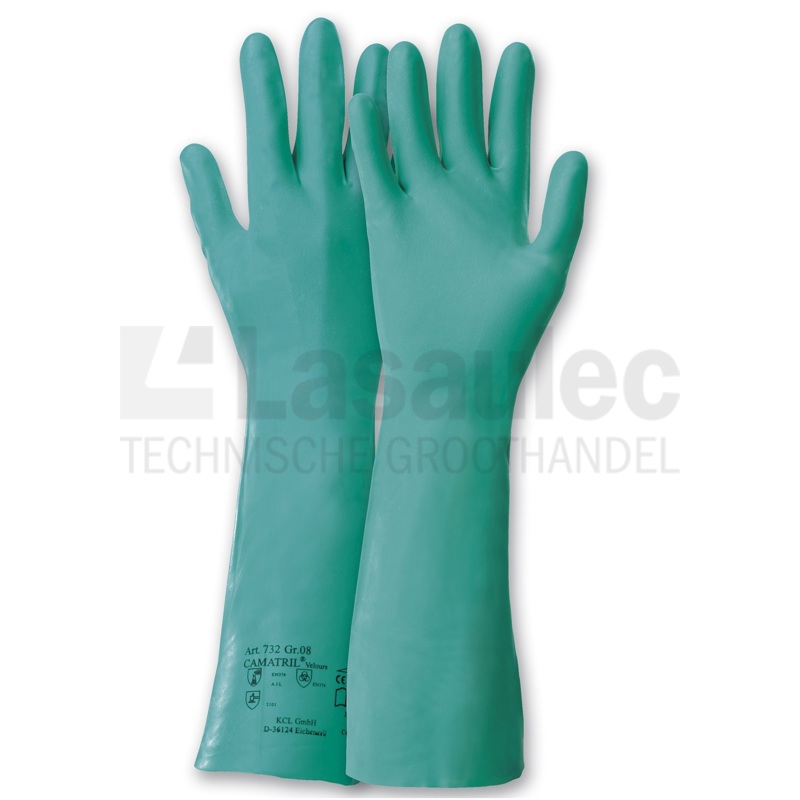 Handschoen voor chemische bescherming vervaardigd uit nitril, voorzien van lange kap, geruwde palm voor vaste greep, gevlokte katoenvoering en gechloreerd oppervlakte. Geschikt voor contact met voedingsmiddelen. Goede antistatische en elektrostatische eigenschappen, goede vingergevoeligheid en siliconenvrij.