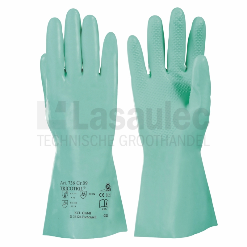 Handschoen voor chemische bescherming, voorzien van gehele nitrilcoating, binnenhandprofilering en naadloze katoen tricot. Goede antistatische en elektrostatische eigenschappen en een goede grip op vette en olieachtige delen. Geschikt voor de levensmiddelenindustrie.