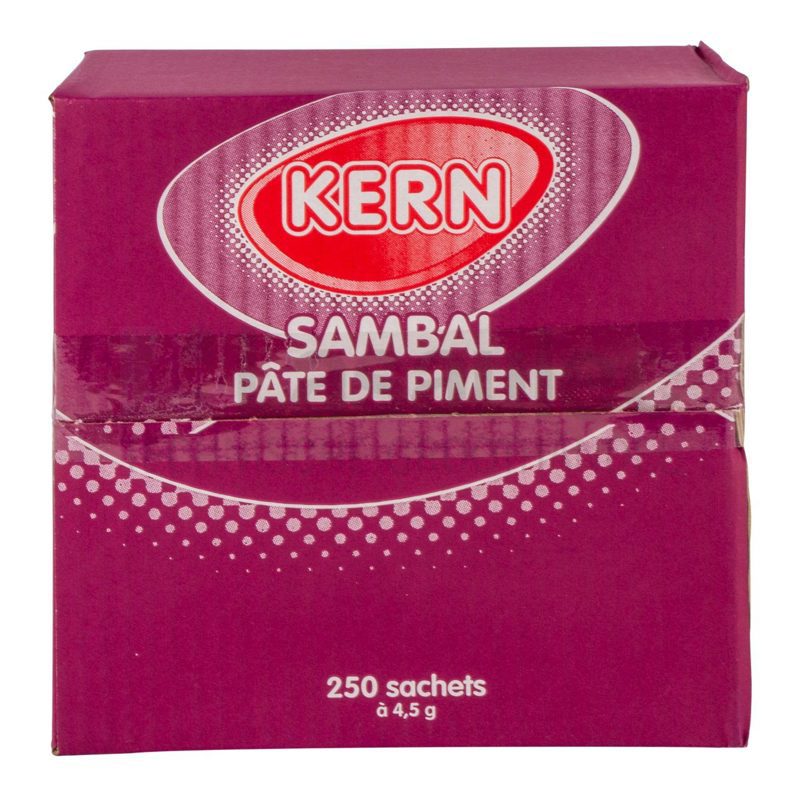 Kern sambalzakjes geleverd in dispenserdoos met 250 stuks a 4,5 gram. De praktische zakjes bieden uitkomst op het gebied van hygiëne, minder verspilling en tijdsbesparing! Eén zakje heeft een inhoud van 4,5 gram sambal en is direct klaar voor gebruik.