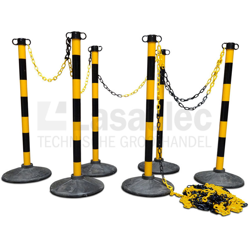 Kunststof kettingpalen set van 6 stevige kunststof kettingpalen, inclusief voeten van gerecycled rubber en 25 meter kunststof ketting.