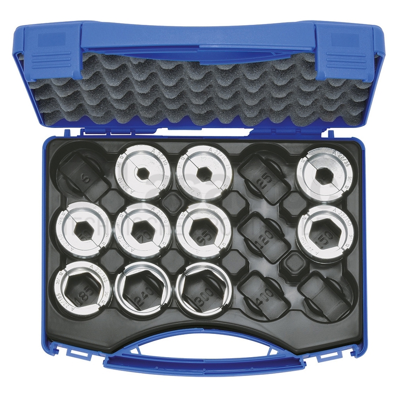 Persbekset in koffer (22-serie) met daarin 11 A-inzetstukken, 10 - 300 mm² ten behoeve van aluminium kabelschoenen met zeskant verpersing.