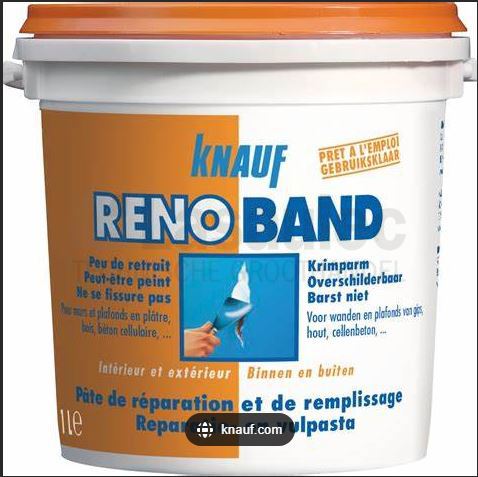Met Knauf Renoband repareer je snel en gemakkelijk gaten en scheuren. Renoband is een gebruiksklaar, superlicht, wit reparatie- en vulmiddel op waterbasis, hoofdzakelijk samengesteld uit vinyl en acrylvulling.