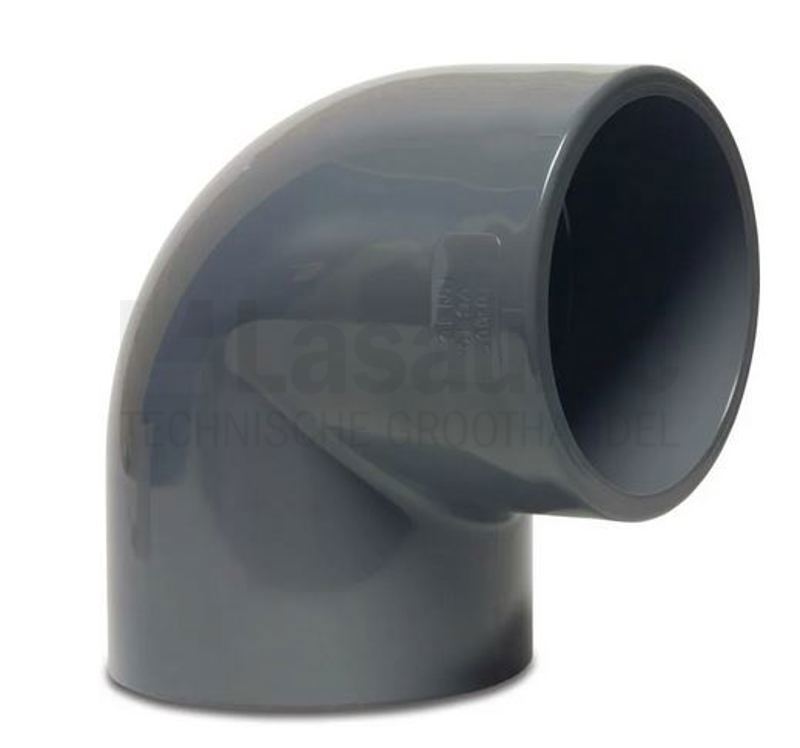 De knie 90°, gemaakt van PVC-U, heeft een lijmmof verbinding en een maximale werkdruk van 16 bar.
