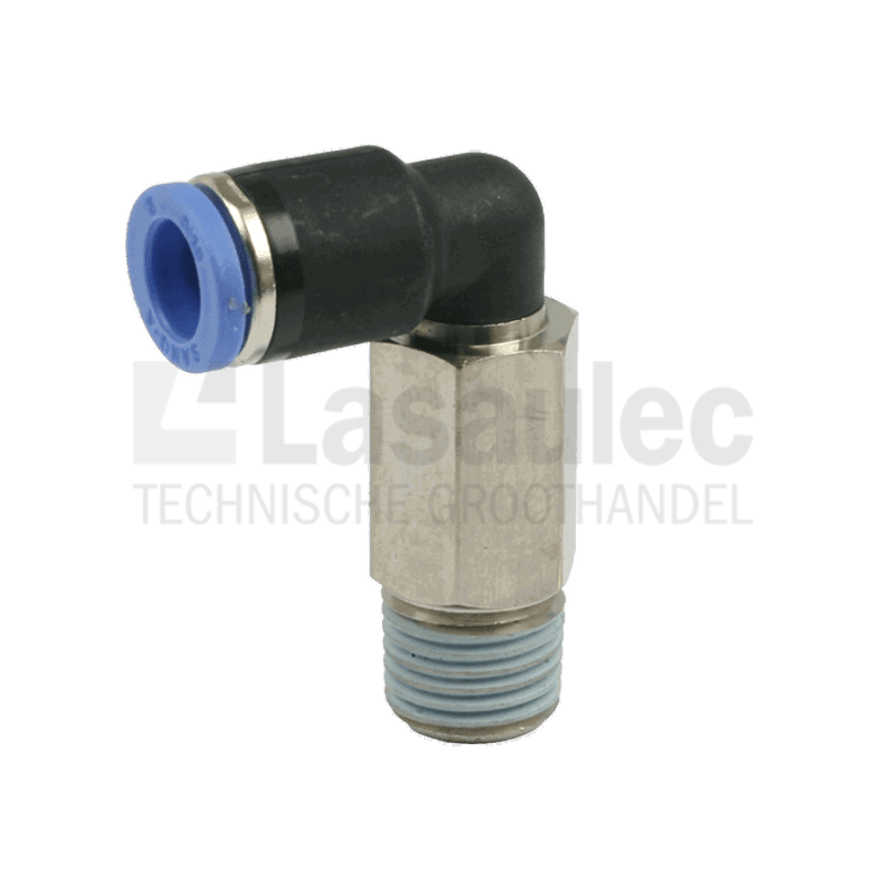 Knie-inschroefkoppeling 90° met uitwendige draad en push-in koppeling. Lange uitvoering.