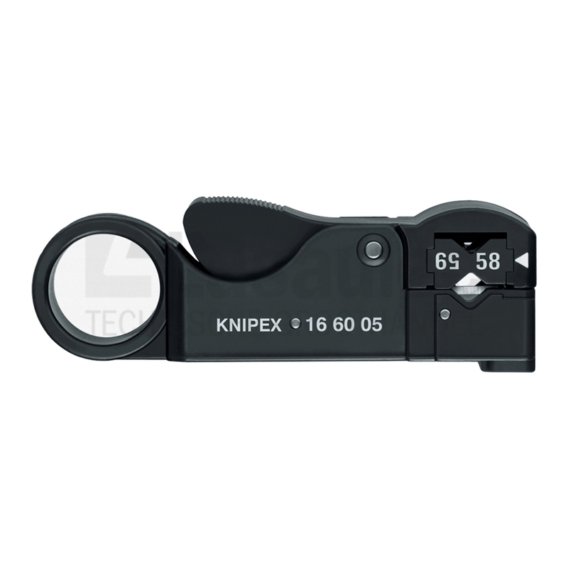 Ontmantelingsgereedschap ten behoeve van coax kabels om buitenmantel, afscherming en kern-isolatie in een beweging af te strippen. Voorzien van drie ingebouwde messen, de snijdiepte kan voor ieder mes afzonderlijk met een inbussleutel aangepast worden en de mesafstand blijft constant. Behuizing is vervaardigd van slagbestendig kunststof.