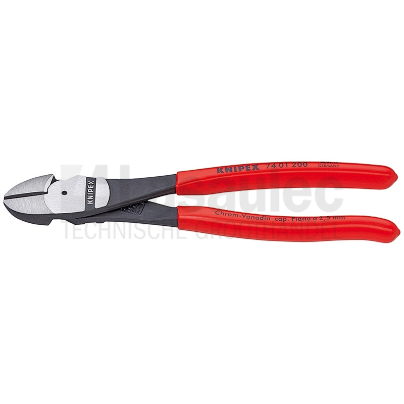 Zijkniptang vervaardigd uit Chroom-vanadium-hoogwaardig staal, gesmeed en in olie gehard. Extra krachtige uitvoering voor zeer hoge en duurzame belasting. Met grote snijcapaciteit bij geringe krachtinspanning door optimale afstemming van snijhoek en overbrengingsverhouding en voorzien van extra inductief geharde precisie snijkanten tot ca. 64 HRC, voor alle draadsoorten, ook pianodraad. Tang zwart geatramenteerd, kop gepolijst en benen met kunststof bekleed.