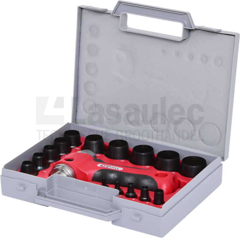 Ring-stans-gereedschapset voor het stanzen van ringen en gaten. Per paar te gebruiken vervaadigd uit chroom vanadium en wordt geleverd in stabiele kunststof koffer. Te gebruiken voor schuimrubber, leer, skai, rubber, kunststof, etc.