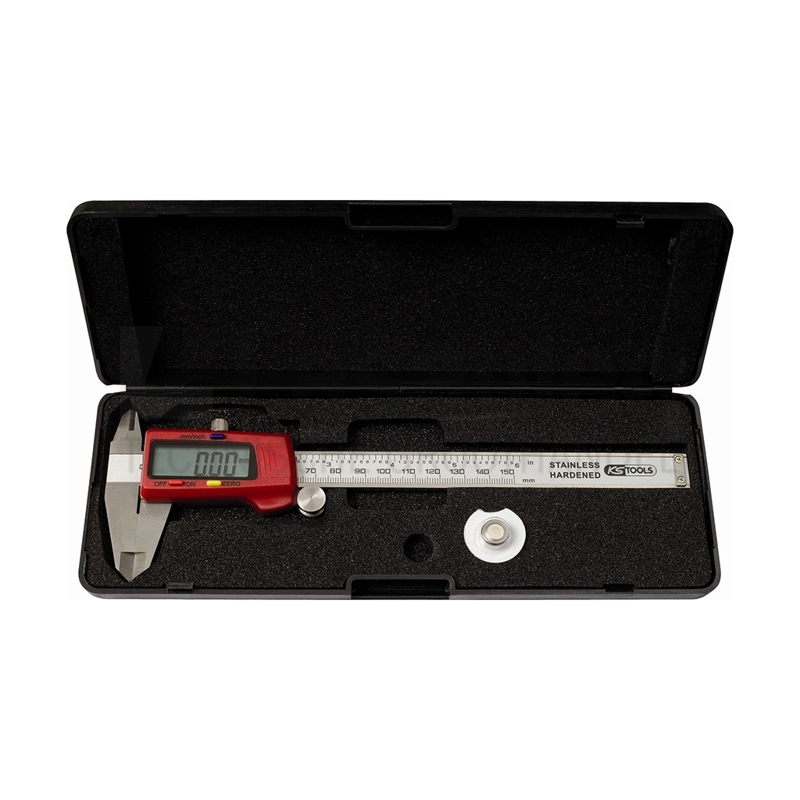 Schuifmaat voorzien van een groot display om afleesfouten te voorkomen. Binnen-, buiten- en dieptemetingen zijn mogelijk, nul-instelling over het hele meetbereik. Wordt met een bijgevoegde batterij in een slagvaste bewaardoos geleverd.