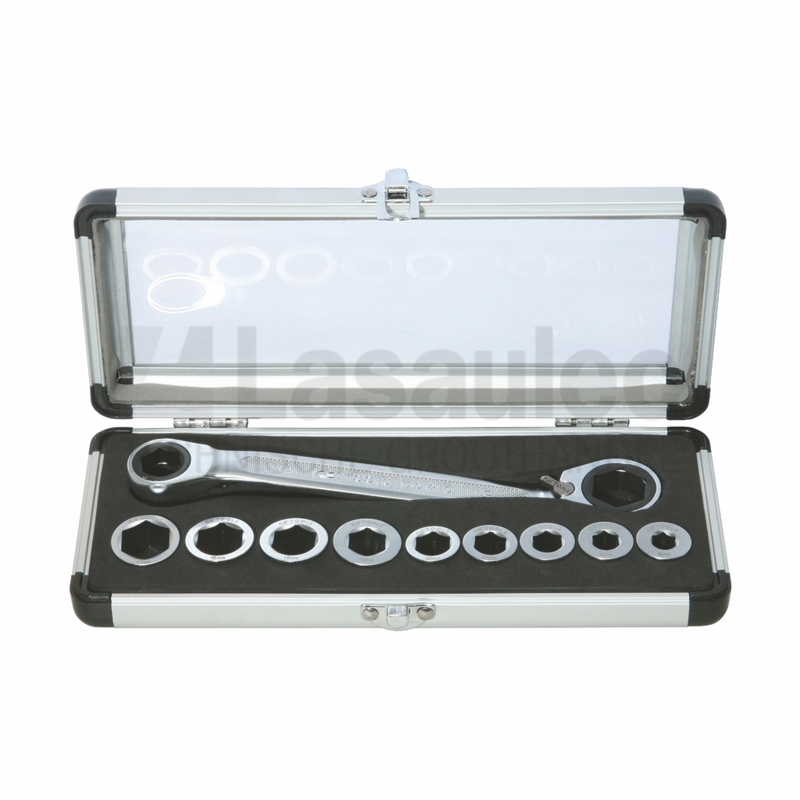 GEARplus® dubbele ratelringsleutelset, 10-delig bestaande uit omschakelbare sleutel voorzien van FlankTraction-Profiel, uitvoering volgens DIN 3110 / ISO 3318 en wordt geleverd in aluminium box.