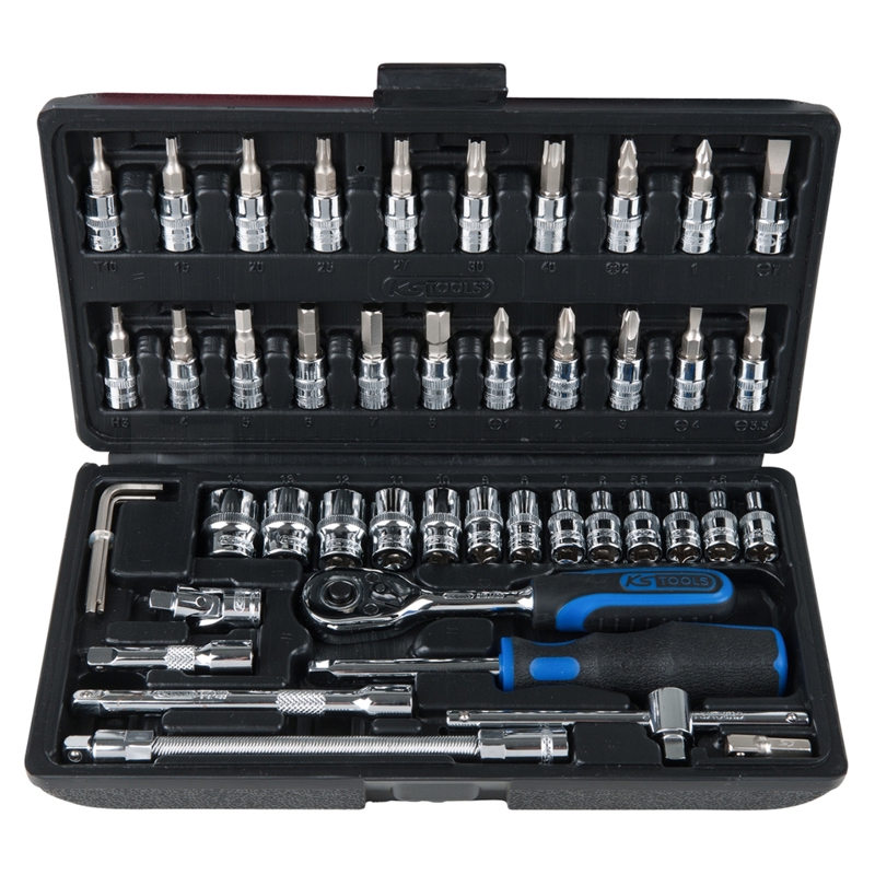Dopsleutelset 1/4", 48-delig, vervaardigd uit hoogglans verchroomd vanadium staal. Voorzien van zeskant dopsleutels met FlankTraction-Profiel en mini omschakelbare ratel met fijne vertanding. Wordt geleverd in stabiele stalen koffer.