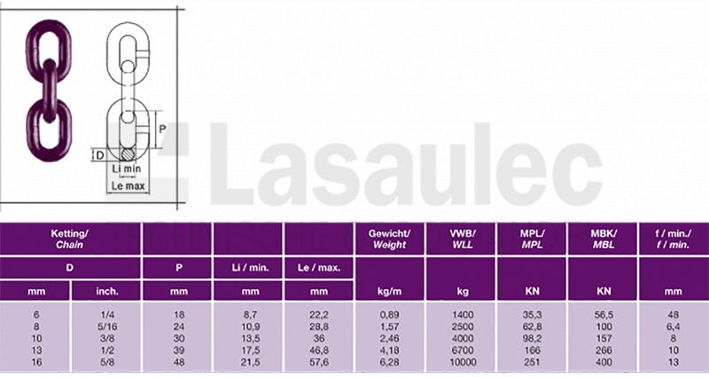 De belangrijkste kenmerken van dit product zijn de constructie uit gelegeerd staal met Grade 100-classificatie, waardoor hij maar liefst 25 % sterker is dan vergelijkbare Grade 80-kettingen. Elke kettingschakel draagt een duidelijke markering voor eenvoudige identificatie. De ketting voldoet aan en – afhankelijk van de leverancier – zelfs meer dan de normen EN 818‑2, NACM en ASTM, inclusief pull‑tests tot 2,5× de WLL . Dankzij de karakteristieke paarse poedercoating is de ketting direct herkenbaar en optimaal beschermd tegen corrosie .