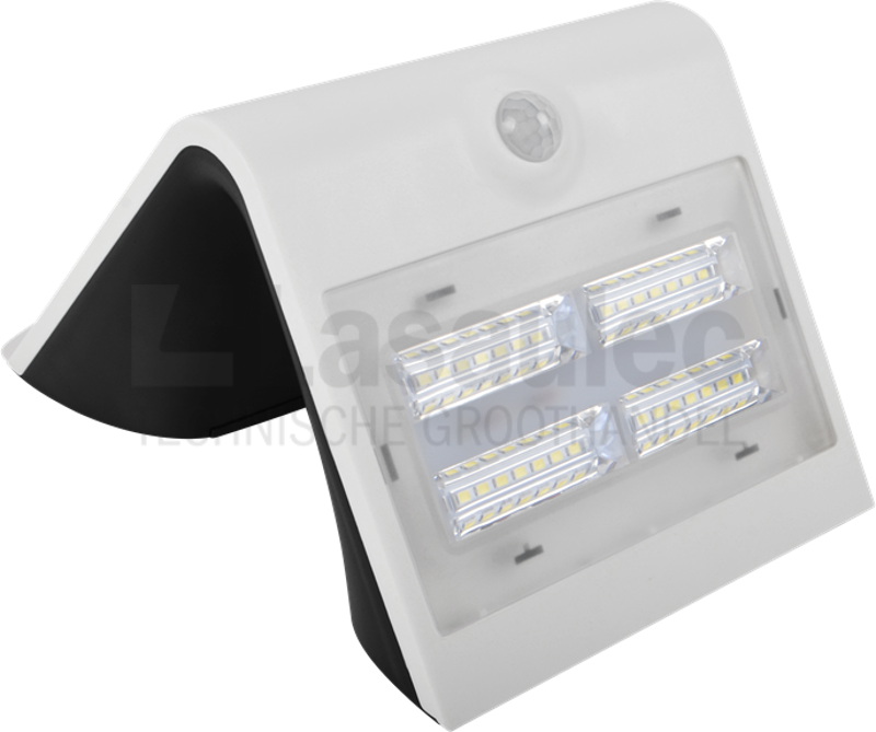 Schijnwerper met een innovatief design en monokristallijn zonnepaneel. Deze buitenlamp is draadloos en makkelijk te installeren. Voorzien van een Lithium Ion batterij, die overdag wordt opgeladen door het zonnepaneel. Het product heeft een lichtsensor, een bewegingssensor, een schijnwerper aan de voorzijde en een lichtje aan de achterkant. Zodra de bewegingssensor beweging waarneemt, gaat de lamp aan op 100% gedurende 10 seconden. Deze lamp is zo in te stellen dat hij automatisch aangaat op 3%, zodra de sensor meet dat het donker wordt (<30lux). Ook is het mogelijk om alleen het achter lampje aan te laten gaan als het donker wordt. De buitenlamp heeft een helderheid van 400Lm, een warm witte kleurtemperatuur van 3000K en een verbruik van slechts 3,2W. De lamp is stof en spatwaterdicht (IP65).