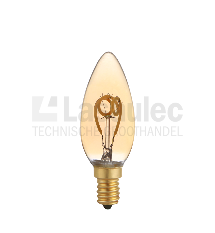 Dimbare gedraaide filament lamp met een E14 fitting, een helderheid van 100Lm en een stralingshoek van 330 graden. Deze glazen lamp heeft een goudkleurige afwerking, een prachtige extra warm witte kleurtemperatuur van 2200K en is de ideale decoratieve sfeerverlichting voor elke kamer in je huis. Kan zowel met een faseaansijdings- als faseafsnijdingsdimmer gebruikt worden. Milieuvriendelijk door het energieverbruik van slechts 3W en de levensduur van 15.000 uur. Dit model heeft de vorm van een kaars en heeft een diameter van 35 mm (C35).