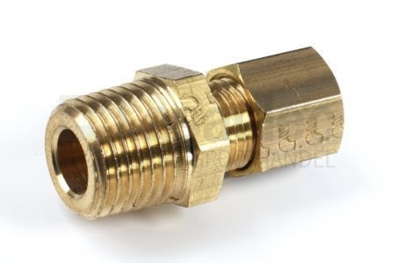 Legris rechte inschroefkoppeling voorzien van uitwendig schroefdraad en zeskant knelkoppeling.
