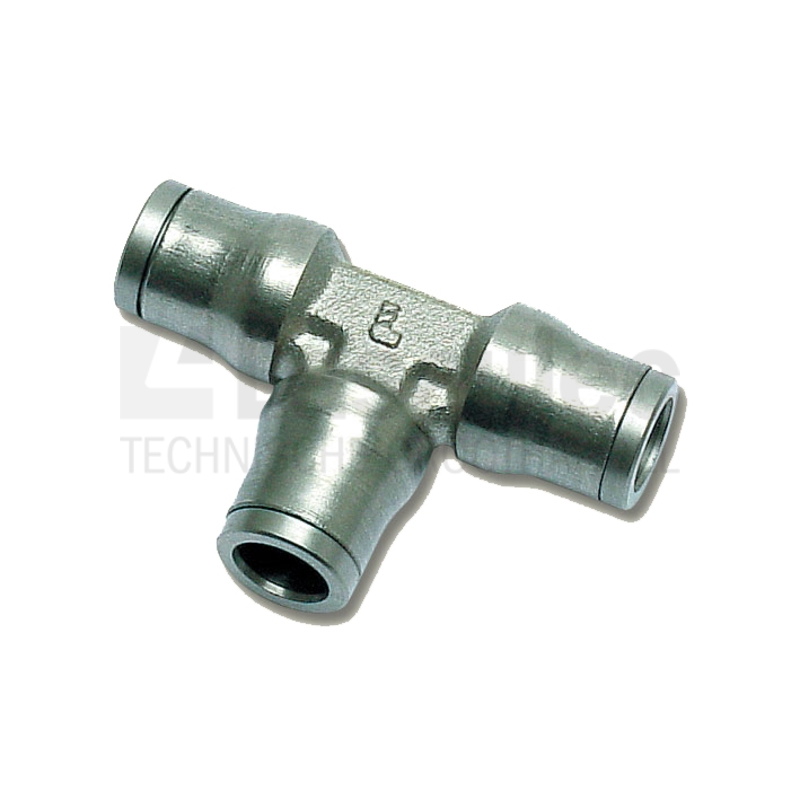 Legris T-koppeling vervaardigd uit vernikkeld messing, voorzien van insteekaansluitingen.