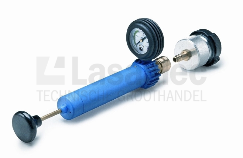 Koelsysteemtester met ontluchtingsventiel en snelkoppeling. Voorzien van manometer en rubber beschermkap, dubbele schaal 0-2,5 bar/0-36 Psi, incl. koelsysteem adapter K60 voor bajonet aansluiting.