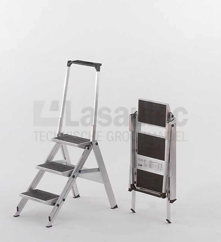 Origineel Little Jumbo werkbordes. Zeer stabiel, degelijk en ergonomisch stavlak met extra grote treden, waar uw hele voet op past. Met neerklapbare veiligheidsbeugel, voorzien van aflegbak voor gereedschap. Door luie oploop te betreden als vaste trap. Ingeklapt zeer compact daardoor praktisch en handzaam in opslag en transport.