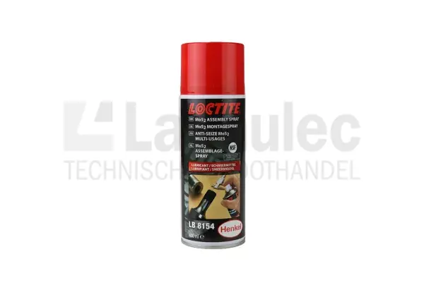 LOCTITE LB 8154 is een zwart anti-seize smeermiddelspray op basis van minerale olie, lithiumzeep en MoS₂, met propaan/butaan als drijfgas. De op minerale olie gebaseerde assemblagepasta met MoS₂ vereenvoudigt de assemblage en demontage van cilindrische onderdelen bij zware bedrijfsomstandigheden. Dit product wordt gewoonlijk gebruikt in toepassingen met een werkingsbereik van -30 tot +450 °C.