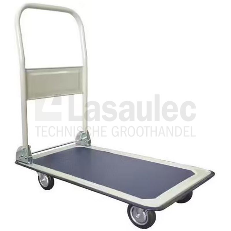 - Compacte metalen wagen met neerklapbare duwbeugel.
