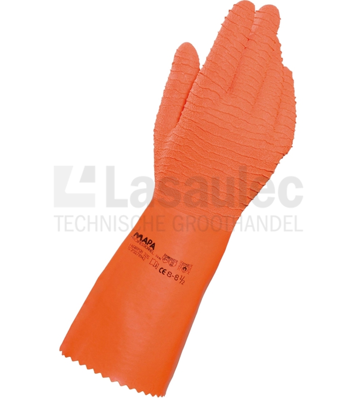 Deze handschoen is bij chemisch beschermende toepassing te beschouwen als wegwerpproduct. Voor meer informatie controleer de permeatie-gegevens voor de resistentie tegen diverse chemicalien!