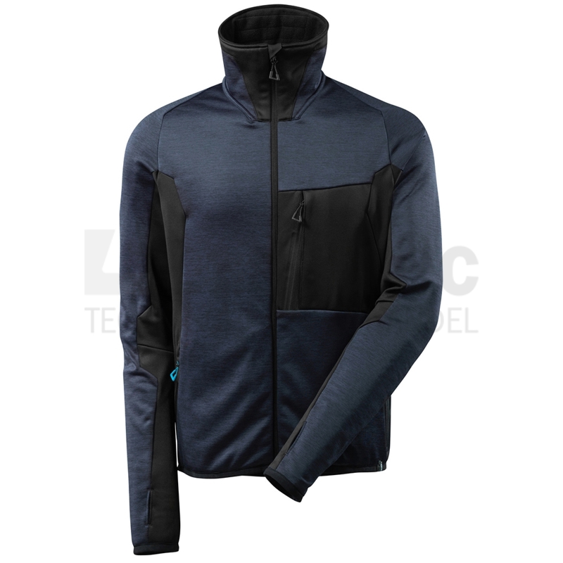Fleecejack voorzien van hoge kraag, voorgevormde mouwen, ritssluiting en inwendige windvanger, borstzak met rits, voorzakken met rits en elastiek bij de pols en aan de onderkant.
