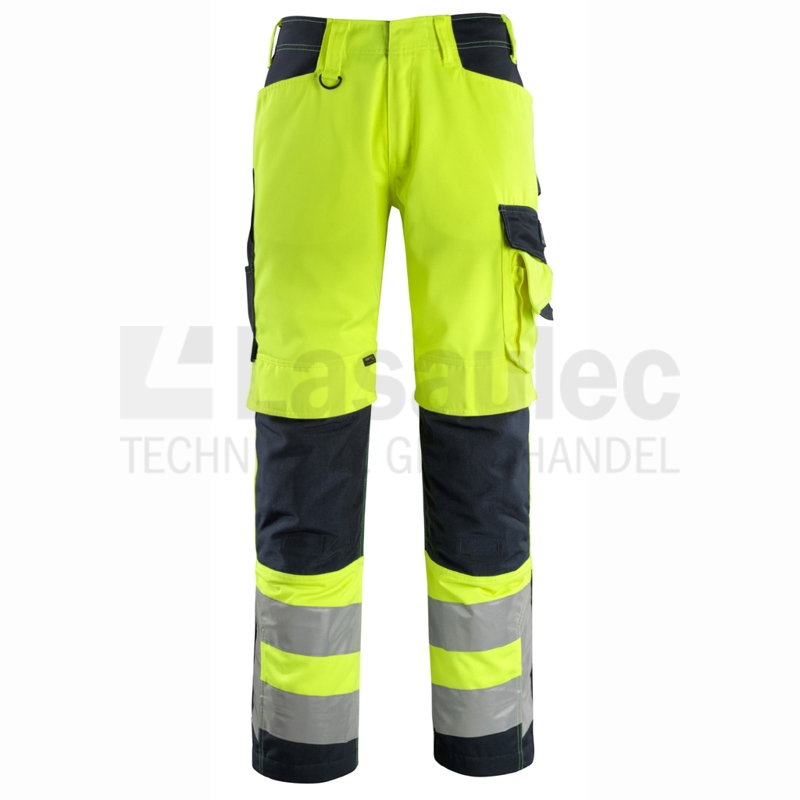 Tweekleurige, fluorescerende werkbroek met reflecties voorzien van vuilafstotende Teflon® , ergonomisch gevormde broekspijpen, lage taille en voorgevormde tailleband, slijtvaste drievoudig gestikte naden aan de broekspijpen en in het kruis, riemlussen, gulp met rits, D-ring, voorzakken, achterzakken met versterking, klep en verborgen drukknopen, verstelbare hamerlus, versterkte dijbeenzak met extra zakken - inwendig telefoonzakje en uitwendig telefoonzakje met klep en magneetsluiting, duimstokzak met CORDURA® versterkingen bij de opening. Verstelbare kniezakken van CORDURA® met klep en opening aan de bovenzijde en verticale reflectie op de buitenkant van de broekspijpen voor betere zichtbaarheid.