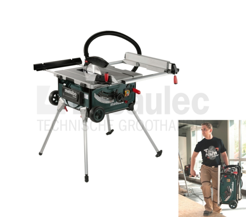 Extreem lichte tafelcirkelzaag met trolleyfunctie voor echte mobiliteit op de bouwplaats voorzien van zeer compact inklapbaar onderstel voor makkelijk transport en ruimtebesparende opslag, geïntegreerd onderstel uit stabiel aluminium persgietwerk (octrooi aangevraagd): in enkele seconden uitgeklapt; staat stevig, kabels en alle aanbouwdelen voor het transport kunnen op de behuizing opgeborgen worden, twee werkhoogtes voor zagen dichtbij de vloer en torsiestijve buisframe constructie voor zeer zware vereisten op de bouwplaats en bij de montage.