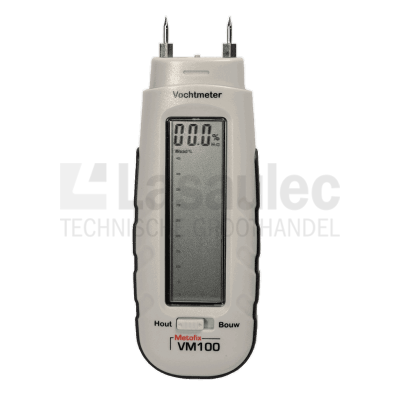 Wil je het vochtgehalte van hout of andere zachte bouwmaterialen weten? De METOFIX VM100 vochtmeter vertelt je direct de vochtwaarde in %. Je neemt hem makkelijk mee naar iedere klus, dankzij het compacte formaat en de slagvaste behuizing. Door middel van de hout- of bouwstand meet je de vochtwaarde van uiteenlopende materialen, zoals hout, gips of pleister.