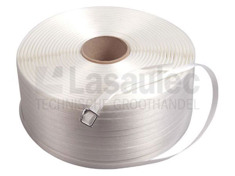 Dit PE (polyester) omsnoeringsband is gemaakt van witte polyesterdraden, die aan elkaar zijn verlijmd d.m.v. hotmelt. Hierdoor onstaat een zeer sterk textielband dat zeer soepel is en uitermate goed bestendig is tegen scheuren of uitrekken. Dit omsnoerband van polyester heeft geen scherpe kanten en is geschikt voor aanspannen van middelzware tot zware ladingen.