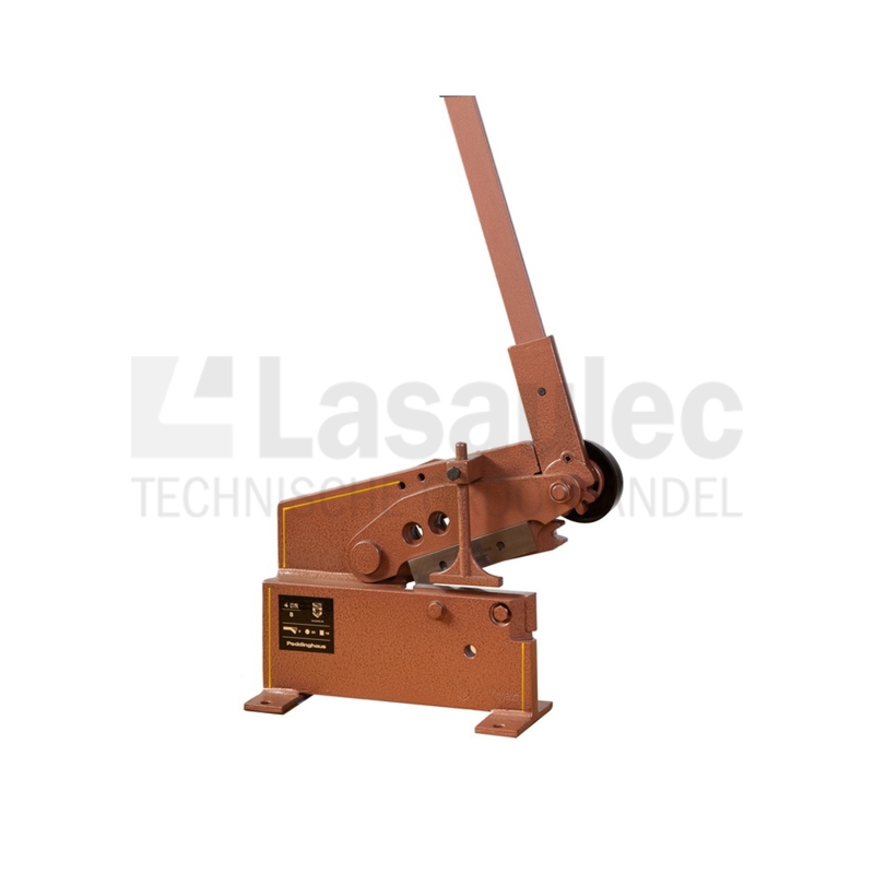 Hefboomplaatschaar voorzien van stabiel schaarlichaam, tandheugel-overbrenging, hoogwaardige messen en hefboombeveiliging. Schaar is traploos instelbaar en knipt plaat-, plat-, rond-, en vierkantijzer.