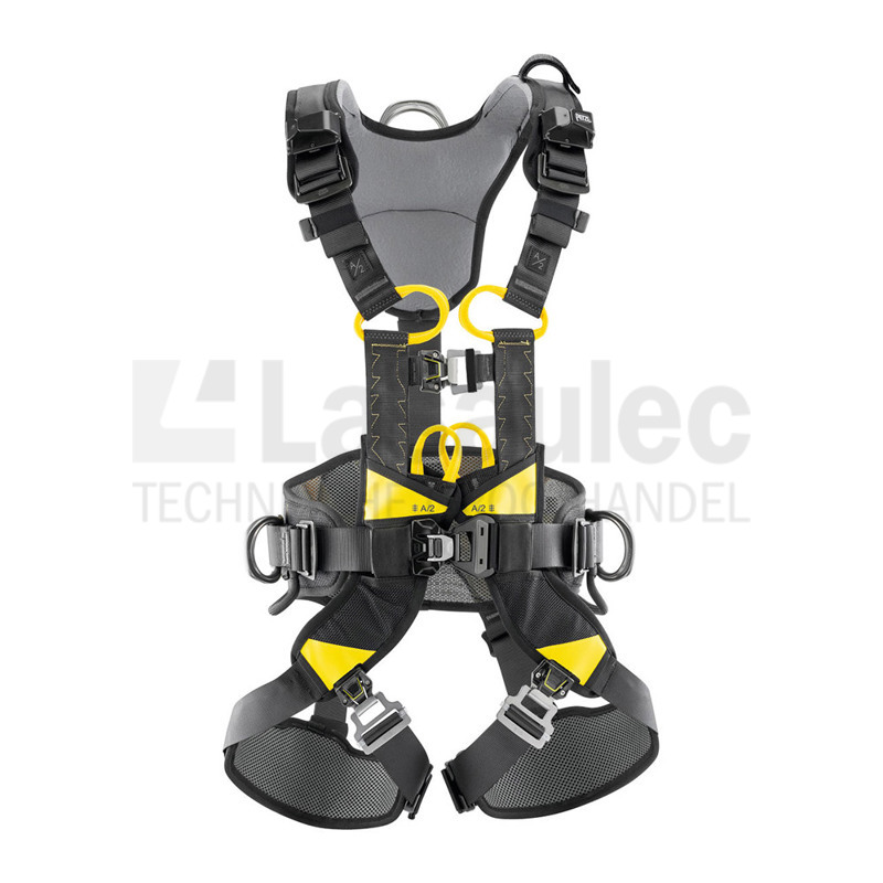 PETZL harnas VOLT WIND EURO C072BA, Veiligheidsharnas voor werkpositionering voor windturbines met klimbeschermingsoogje voor verticale beweging op een rail of draadkabelgeleid systeem. Het harnas kan zeer snel worden aangetrokken met de voeten op de grond dankzij de automatische FAST LT PLUS en FAST LT gespen. Het harnas is voorzien van een LADDER CLIMB klimbeschermingsoogje. Het is uitgerust met een slijtagebescherming in het gebied van de heupgordel en het dorsale valstopoog om slijtage bij het verplaatsen in de windturbinetoren te verminderen. Heupgordel en schouderbanden zijn voorzien van zelfsluitende DOUBLEBACK-gespen. Bij een val gaat de valstoplus automatisch in de sternale positie om na de val een rechtopstaande houding te garanderen. Aan de bevestigingspunten aan de zijkant kan een zitplank worden bevestigd om het comfort bij het werken in een vrijhangende positie te verbeteren. Het harnas is verkrijgbaar in de maten 0 (2XS-S), 1 (S-L), 2 (L-2XL). Materiaal: polyamide, polyester, aluminium, staal. Productkenmerken: LADDER CLIMB-risers. Laterale zeilringen. Veiligheidsgordels. Laterale zeilringen. Achterste veiligheidsgordels. Gordels aan de achterkant van de heupgordel. Gewicht: ca. 2200 g. Garantie: 3 jaar. Norm: EN 361, EN 358, EN 813