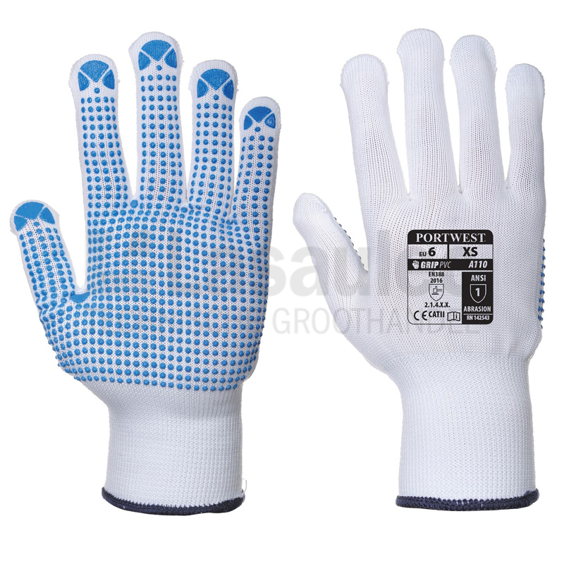 Handschoen gemaakt van nylon 13 gauge drager, ademende naadloze voering en met PVC dots op de handpalm en vingers voor betere grip. Hoge gevoeligheid en voor droge omstandigheden.