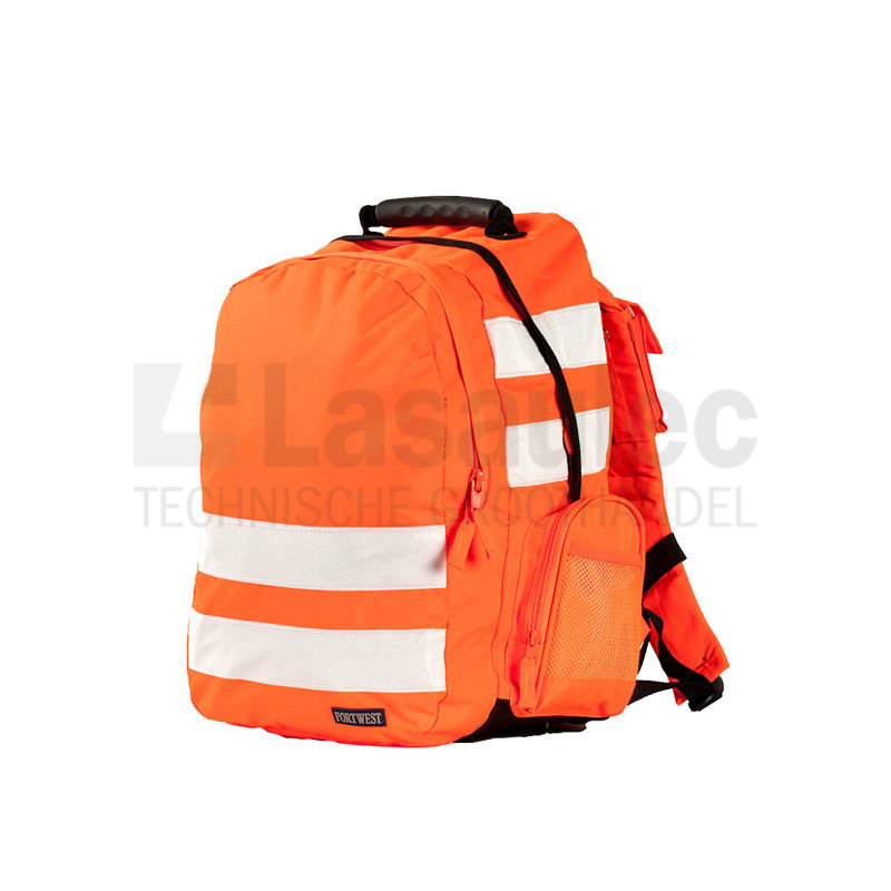 Rugzak in high-vis voorzien van geïntegreerde zak voor MP3/mobiele telefoon, verschillende zakken. Tevens uitgevoerd met gevoerde dubbele handvaten en gevoerd achterpaneel voor meer comfort. Het doek en de reflecterende striping voldoen aan de vereisten van EN ISO 20471.